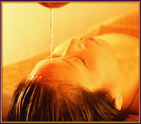 第3の目と言われる眉間に温かい薬草オイルを贅沢に垂らしていく「シローダーラー」
